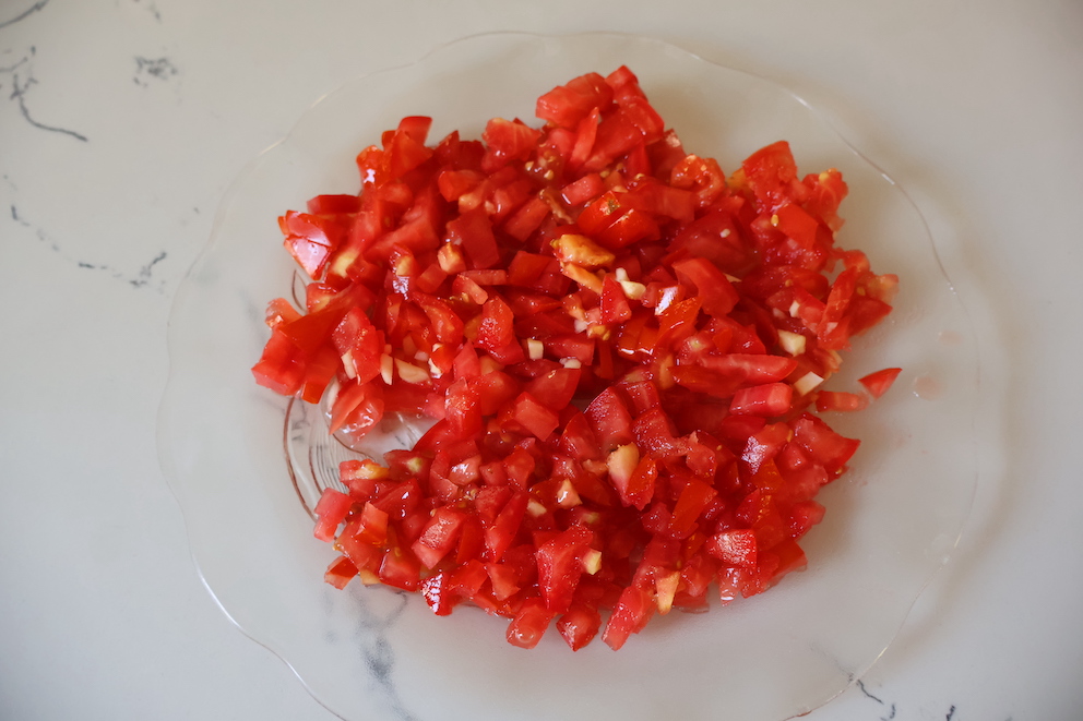 - Soğanı, domatesi, sarımsakları ve yeşil biberleri yemeklik doğrayalım.
