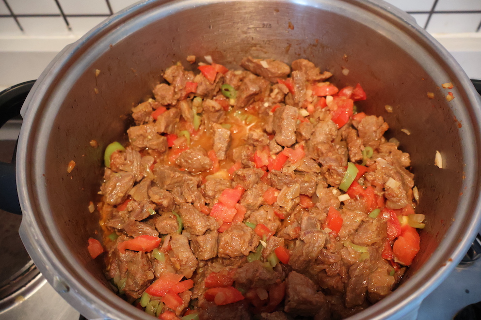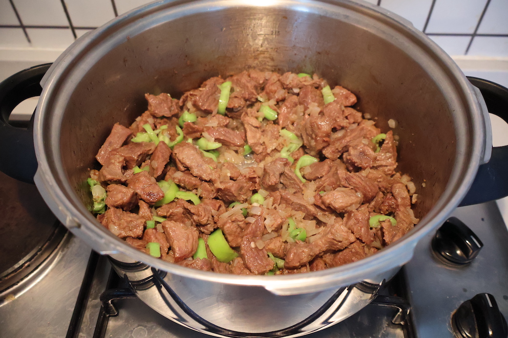 - Biberleri ekledikten sonra etleri tencerenin kapağı kapalı olarak 2-3 dakika daha pişirelim ve sonrasında domates salçasını ekleyelim ve tencerenin kapağını kapatalım.