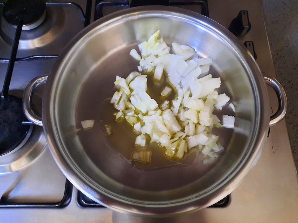 - Tencereye önce soğanı ekleyelim, üzerine zeytinyağını ve kabakları koyalım.