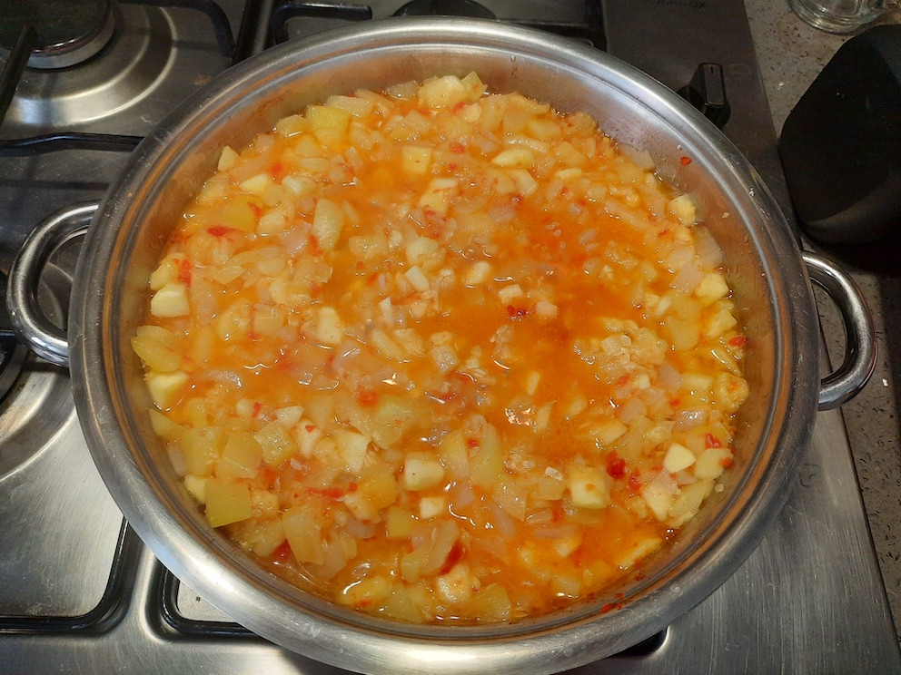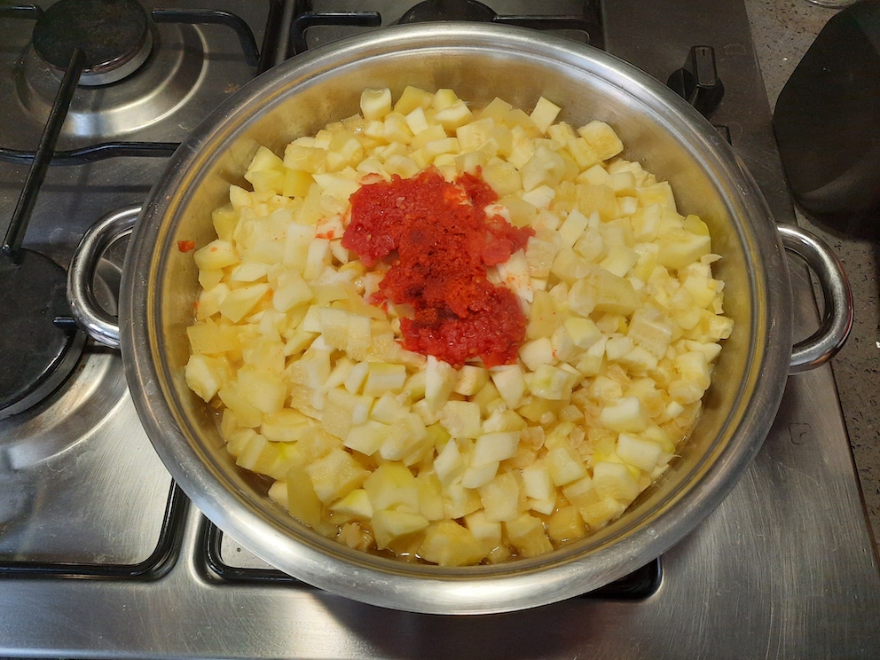 - Eklediğimiz kabakların üzerine sırasıyla domates sosunu, tuz ve tatlı toz biberi ve ezilmiş sarımsakları ekleyelim.