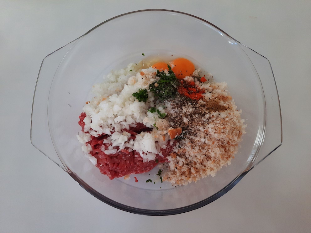 - Üzerine kıymayı, yumurtayı, ekmek içini, karbonatı, karabiberi, tuzu, kekiği, sarımsağı ve kıyılmış maydanozu ekleyelim. Karışımı 10 dakika boyunca yoğuralım.