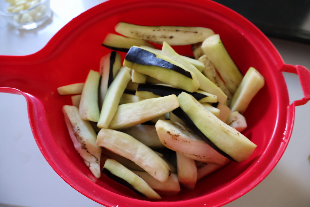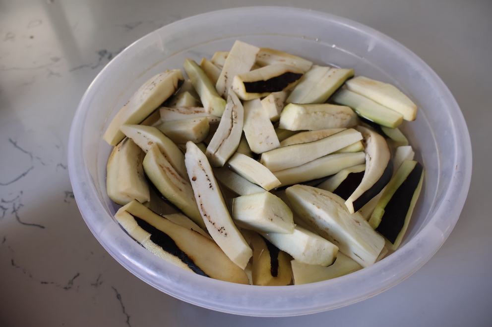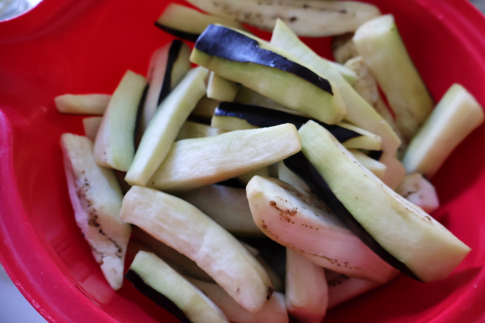 - Patlıcanları yıkayıp keselim, geniş bir kaba koyalım. Üzerine soğuk su ve 2 tatlı kaşığı tuz ekleyerek yarım saat bekletelim.