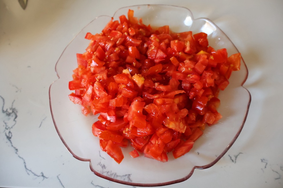 - Domatesleri yıkayalım, küçük küpler halinde doğrayalım.