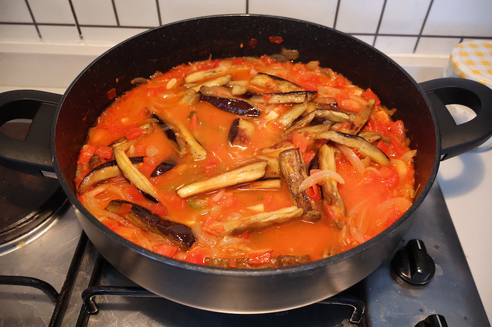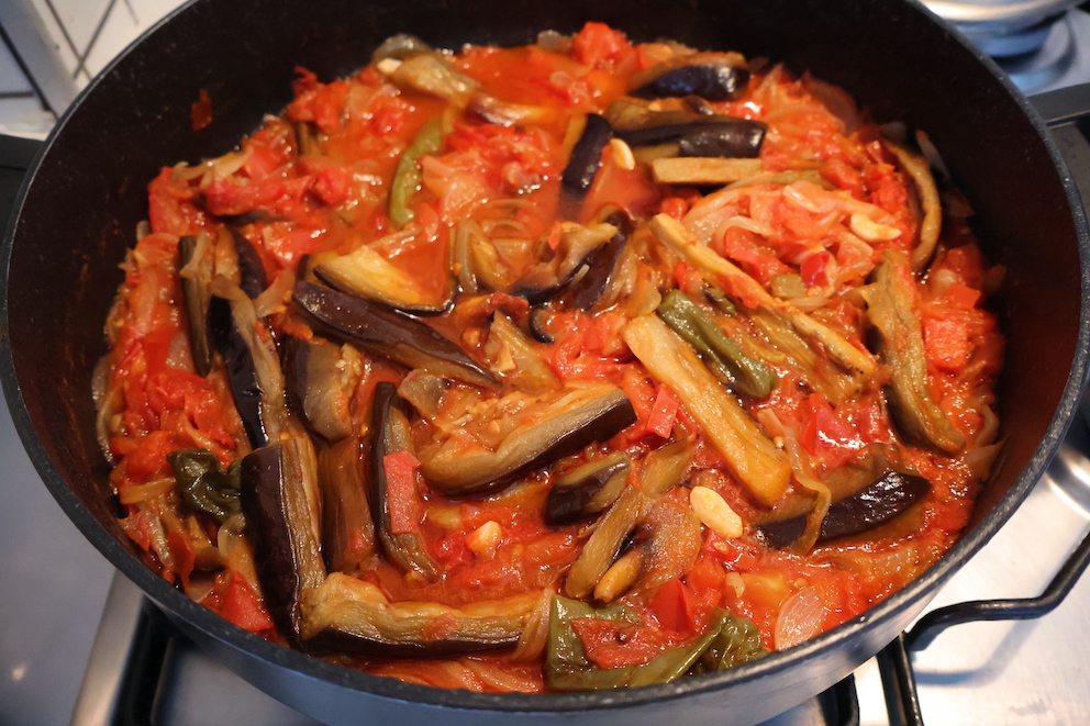 - Pişen karışımın üzerine sıcak suyu ekleyelim. Sıcak suyu ekledikten sonra su kaynamaya başlayınca fırından aldığımız patlıcanları karışımın üzerine ekleyelim.