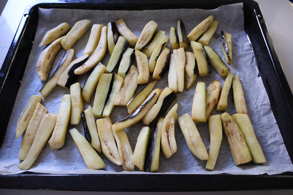 - Yağladığımız patlıcanları fırın tepsisine dizelim. Önceden ısıtılmış fırında 200°`de 30 dakika pişirelim.