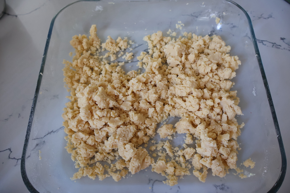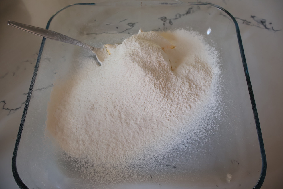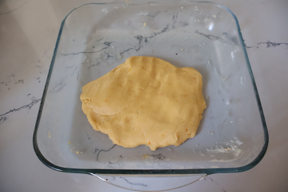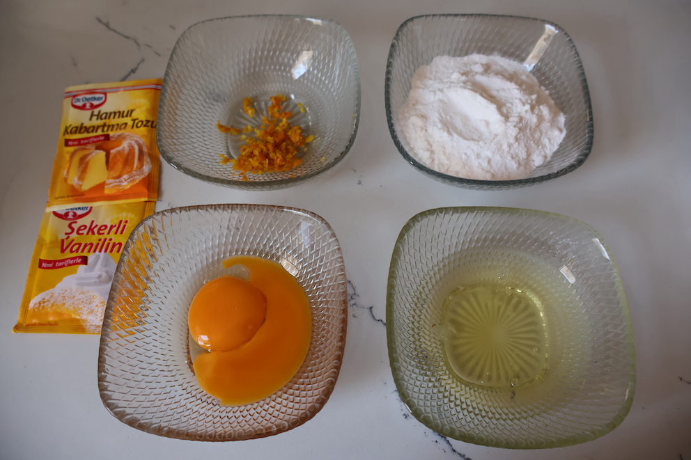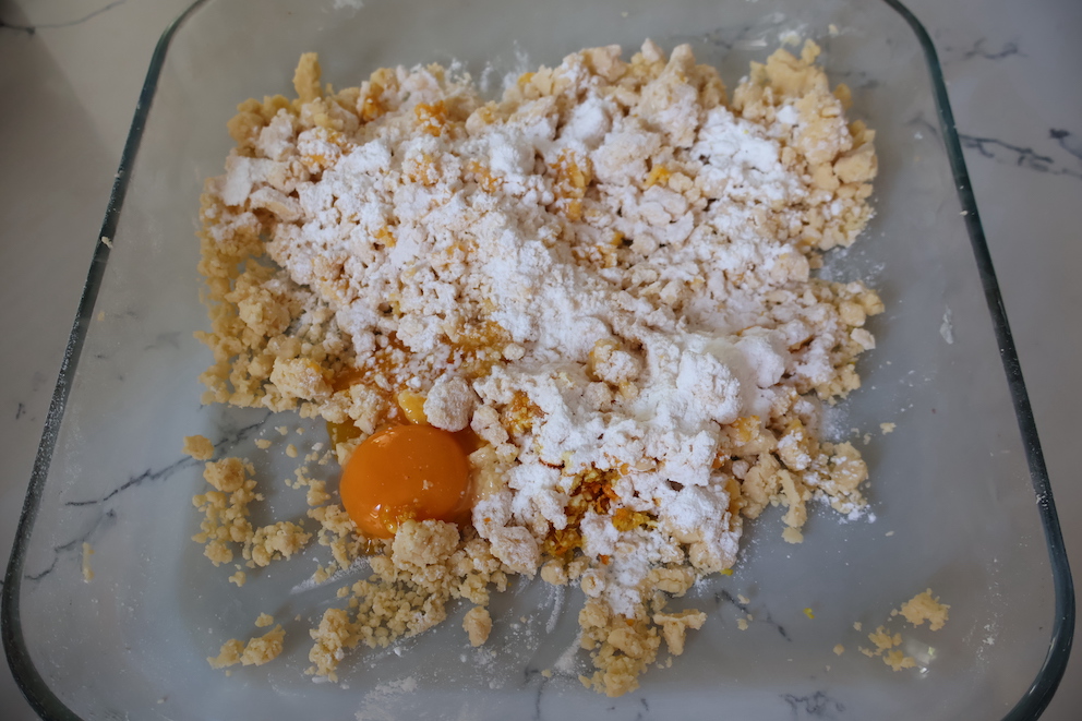 - Karıştırdığımız un ve yağın üzerine pudra şekerini, yumurtaların sarılarını,limon kabuğu rendesini, vanilyayı, karbonatı ekleyip yoğuralım.