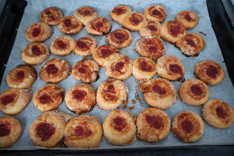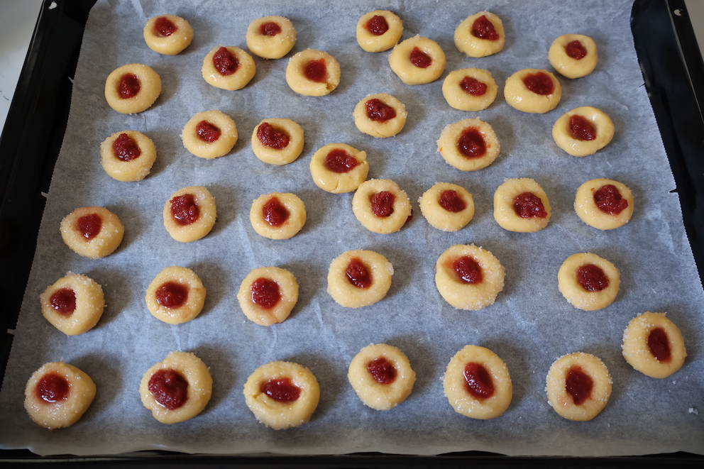 - Fırın tepsisine yerleştirdiğimiz kurabiye hamurlarının ortadaki çukur kısımlarına marmelatı ekleyelim.