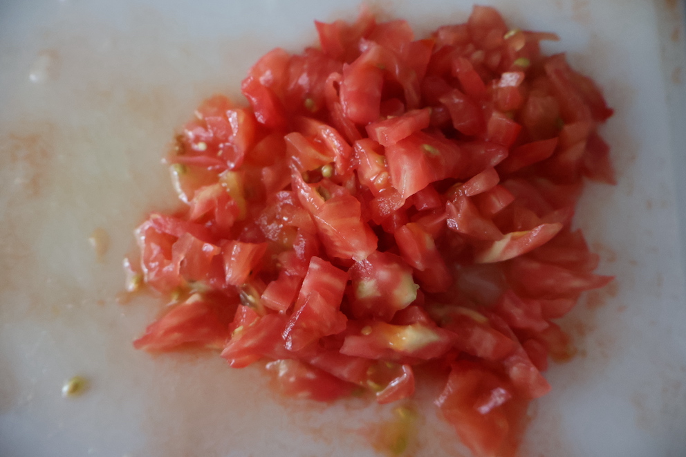 - Soğanı yemeklik doğrayalım. Domatesi yıkayıp yemeklik doğrayalım.