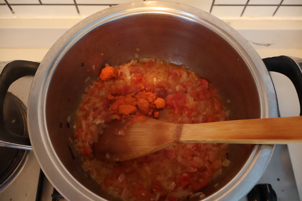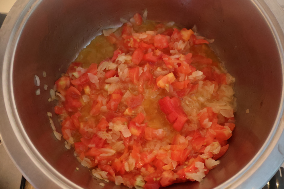 - Kavurduğumuz soğanın üzerine domatesi ekleyelim ve domates pişene kadar kısık ateşte tencerenin kapağı kapalı olarak pişirelim.