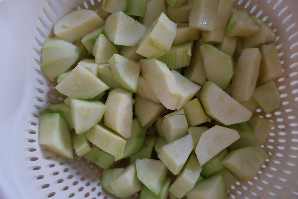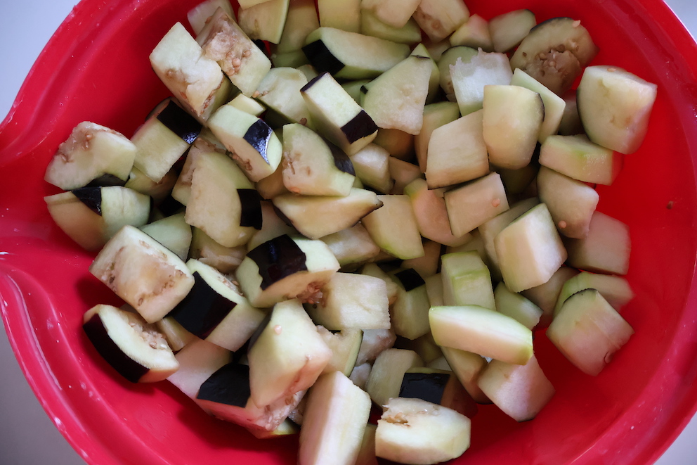 - Patlıcanları yıkayalım ve alacalı soyup küçük küpler halinde doğrayalım. Geniş bir kapta tuzlu suda yarım saat bekletelim.