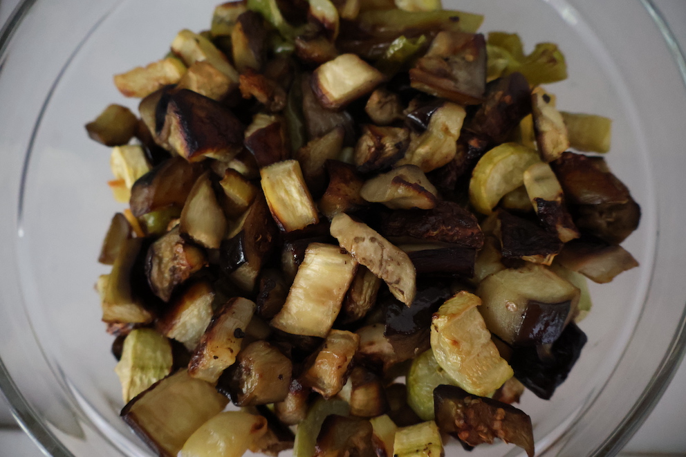 - Kabakları yıkayıp soyalım ve küçük küpler halinde doğrayalım. Doğranmış kabakları ve tuzlu suda bekleyen patlıcanları önceden ısıtılmış fırında 220°'de 35 dakika pişirelim.