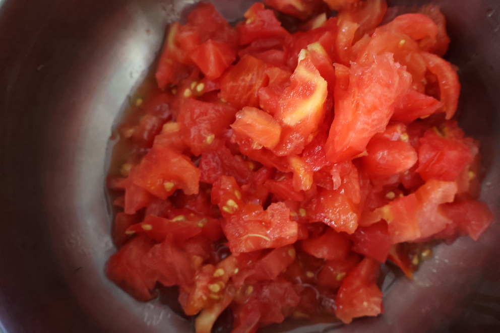 - Domatesleri yıkayalım ve küçük küçük doğrayalım. Yıkanmış domatesleri küçük bir tencereye koyalım.