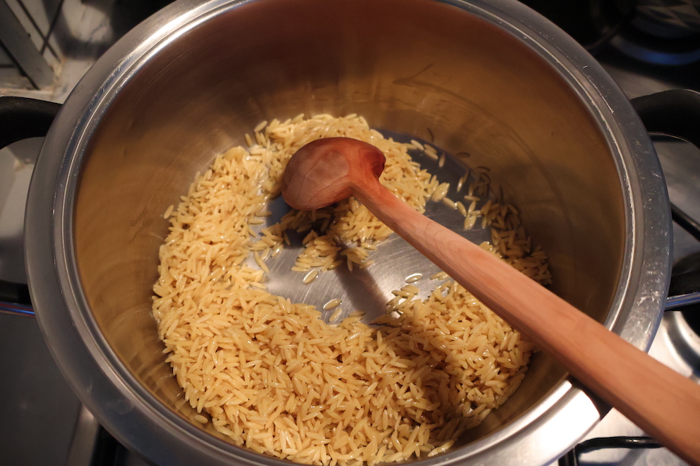 - Zeytinyağını tencereye alalım. Şehriyeleri ve sarımsakları zeytinyağında kavuralım.